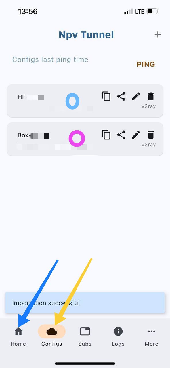 5: توجه داشته باشید که تمام کانفیگهای ما در تب Config اضافه میشه و برای جابجایی بین کانفیگها باید برنامه در حالت دیسکانکت باشه نمونه ای از کانفیگها را در برنامه مشاهده میکنیم و برای انتخاب هر کانفیگ باید روی ان ضربه بزنیم تا انتخاب شود 👍