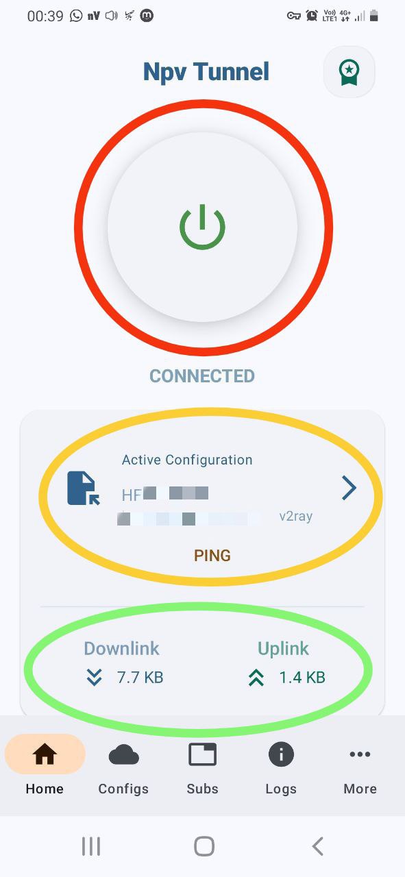 6:برای کانکت کردن به تب Home میرویم و در اینجا در قسمت Active Configuration اسم کانفیگی که در تب Config انتخاب کردیم مشاهده میکنیم و برای کانکت شدن روی دایره وسط ضربه میزنیم و تمام. توجه داشته باشید که که برای جابجایی بین کانفیگها باید برنامه را دیسکانکت کنیم و اقدام به جابجایی کنیم لطفا به اسم کانفیگها دقت کنید 🌎