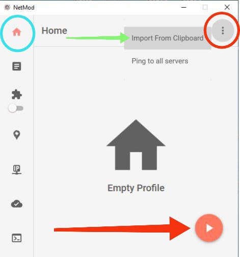 4 حالا برنامه باز شده و روبروی شماست ابتدا کانفیگی که از ما تهیه کردید را کپی کنید و برای وارد شدن کانفیگ در برنامه گزینه (Import From Clipboard) را بزنید و کانفیگ در لیست برنامه نشان داده میشود و برای اجرا شدن کانفیگ علامت پلی ► را میزنیم و طبق عکس پیش برید ♥