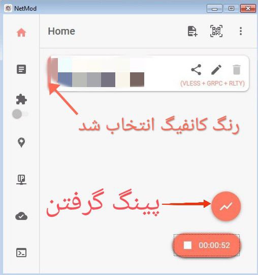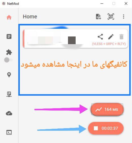 5 در اینجا مشاهده میکنیم که علامت پلی ► مرحله قبل به علامت استاپ ■ تبدیل شده که به مفهوم کانکت شدن میباشد. (طبق عکس فلش آبی) و درقسمت مشخص شده فلش بنفش پینگ کانفیک نمایش داده میشود که ابتدا به شکل دایره هستش و با هر بار ضربه روی آن پینگ کانفیگ نشان داده میشود. و اون کادر مربع آبی رنگ جایگاه کانفیگهای ما میباشد و هر کانفیگی که انتخاب شده باشد کنار کادر آن کانفیگ رنگی میباشد ♥