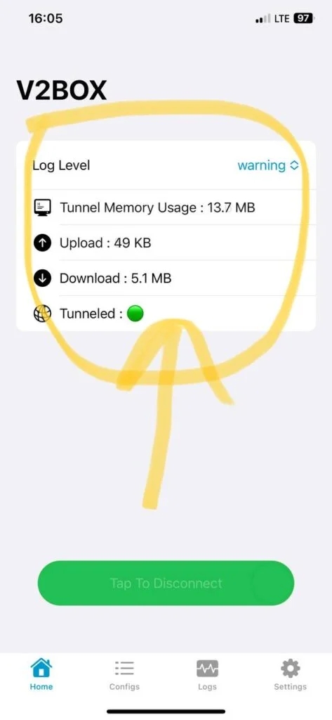 کار شما به پایان رسید و با موفقیت توانستید متصل شوید. اگر در قسمت مشخص شده در عکس زیر حجم در حال مصرف هست یعنی کانفیگ شما سالم هست و با موفقیت توانستید متصل شوید.