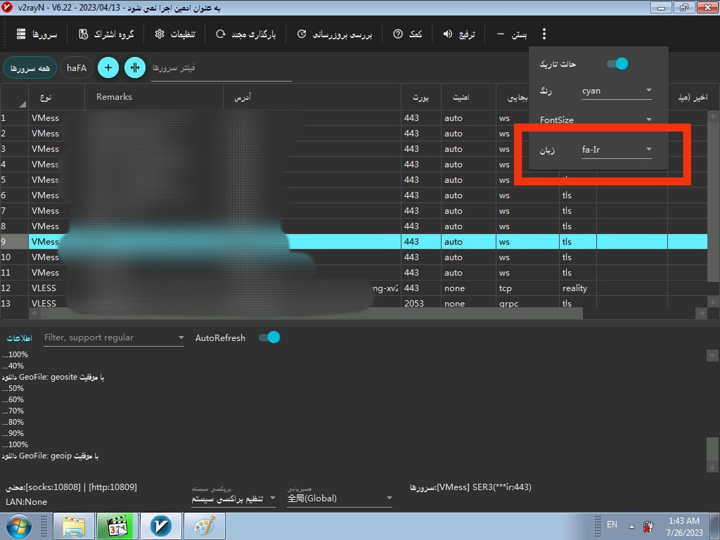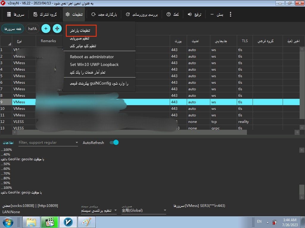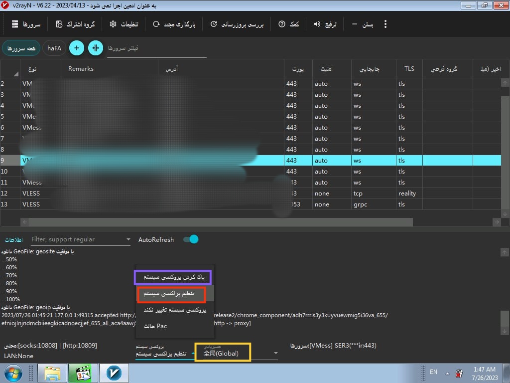 7 برای فعال کردن پروکسی گزینه تنظیم پراکسی سیستم که با رنگ قرمز مشخص شده را انتخاب کنید و برای غیر فعال کردن پراکسی گزینه پاک کردن پروکسی سیستم را انتخاب کنید و گزینه مسیر یابی را روی گلوبال قرار دهید. به عکس زیر توجه کنید.