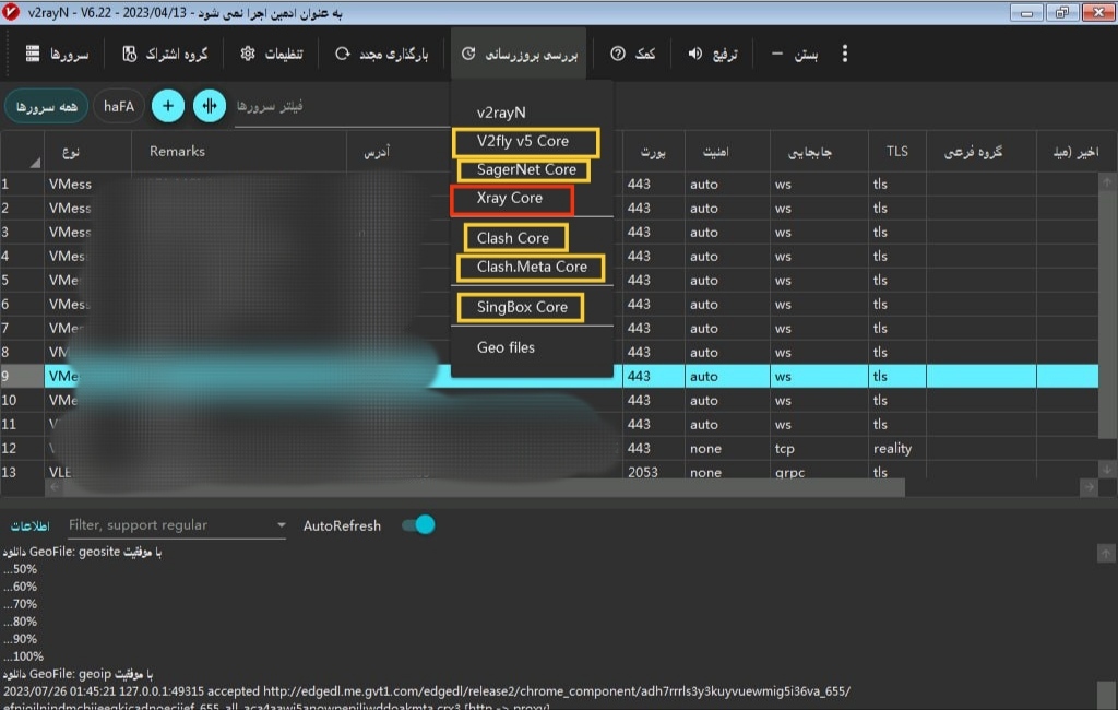 6 و حالا از قسمت بررسی بروزرسانی تمام گزینه هارو مخصوصا گزینه Xray Core را بروزرسانی کنید.